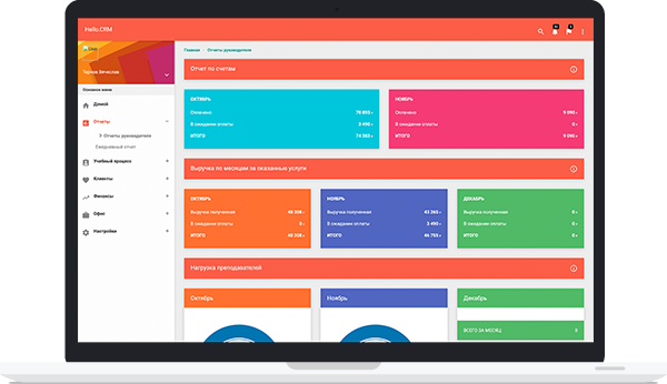 Вы всегда будуте знать сколько Вам еще должны оплатить, сколько заключено новых договоров, а так же сколько отведено уроков. Помимо этого есть еще несколько отчетов, которые формируются в пару кликов!